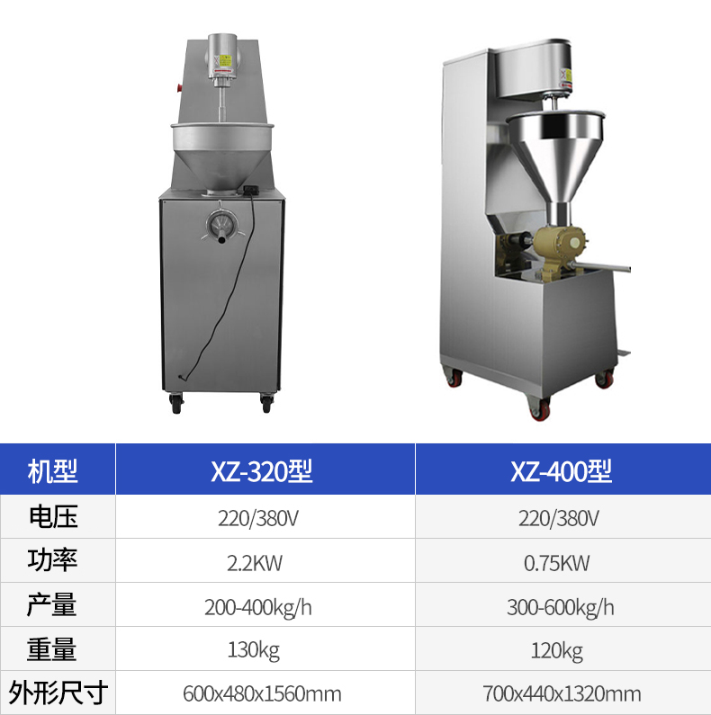 新款XZ-320不銹鋼灌腸機(jī),為XZ-200型和XZ-300型灌腸機(jī)的升級(jí)產(chǎn)品,優(yōu)勢(shì)在于絞龍出料部縮短、絞龍加大,對(duì)肉片、肉顆粒的損傷更小,肉片完整性更高,出料更快。